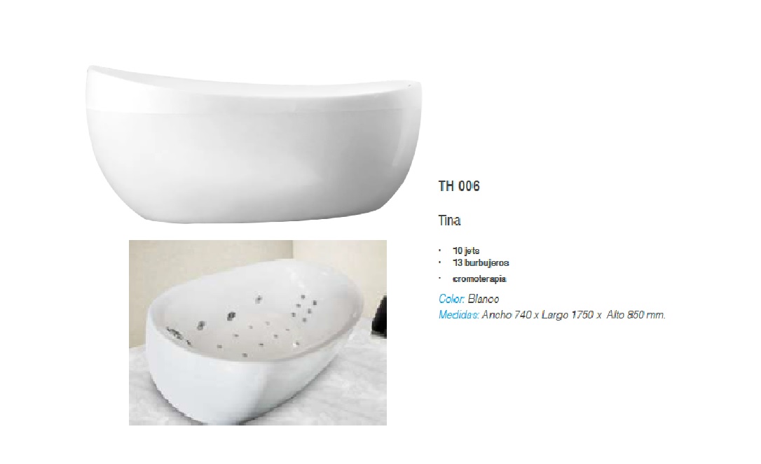TECHNOBATH TINA HIDROMASAJE Y CROMOTERAPIA TH 006 • 10 jets • 13 burbujeros • cromoterapia Color: Blanco Medidas: Ancho 740 x Largo 1750 x Alto 850 mm. IVA incluido